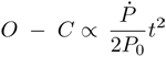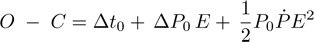 where the epoch is E=t/P and the change in arrival time with epoch, dt/dE, is simply the period, P. If we drop all terms higher than second order (assuming that the period acceleration is negligible), we arrive at the classic (O-C) equation: